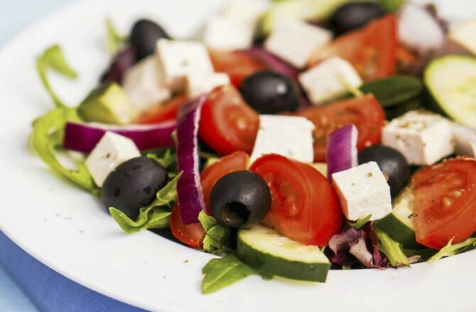 Greek salad with fresh veggies, olive oil, wine vinegar, feta, olives, etc.